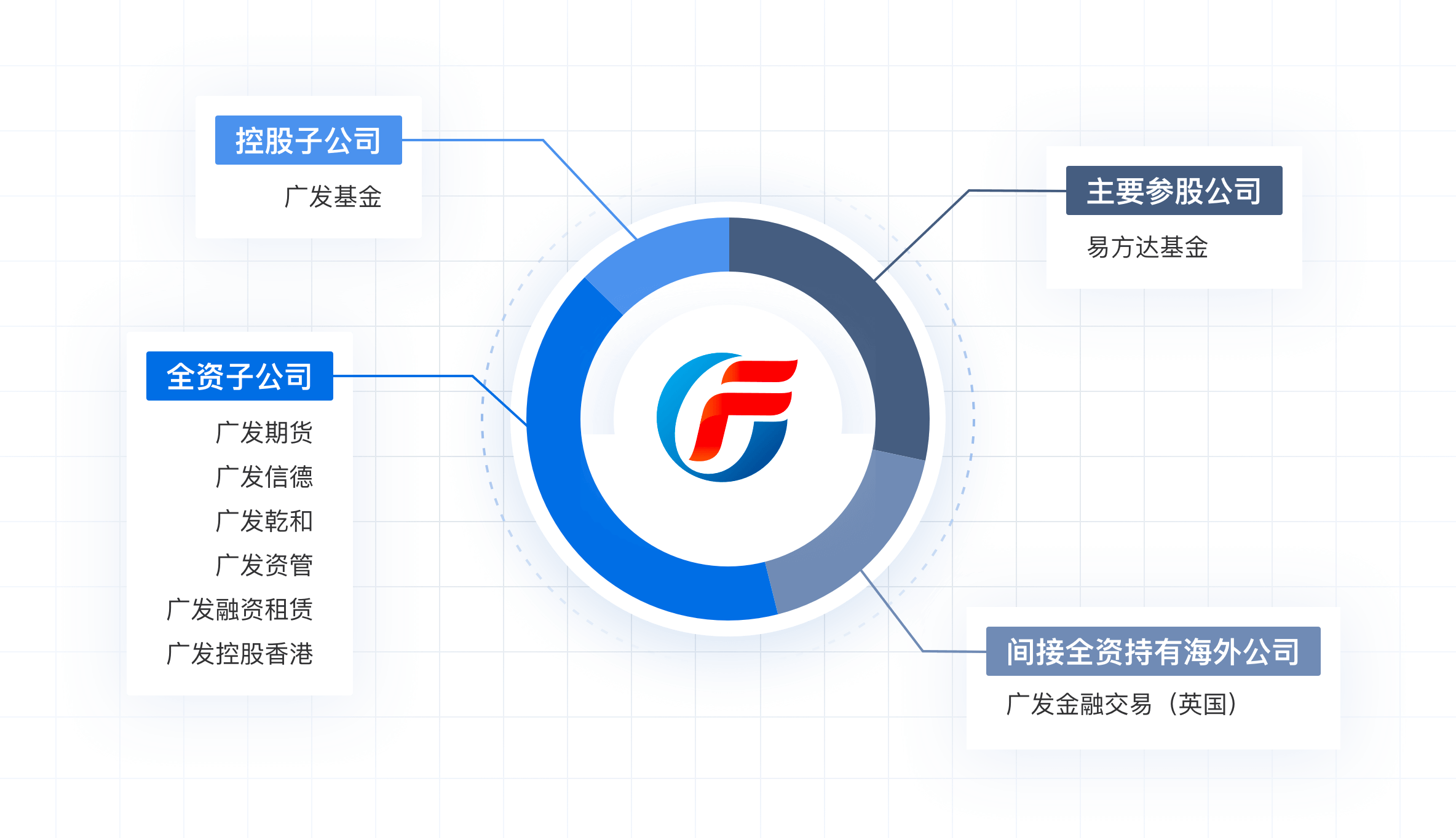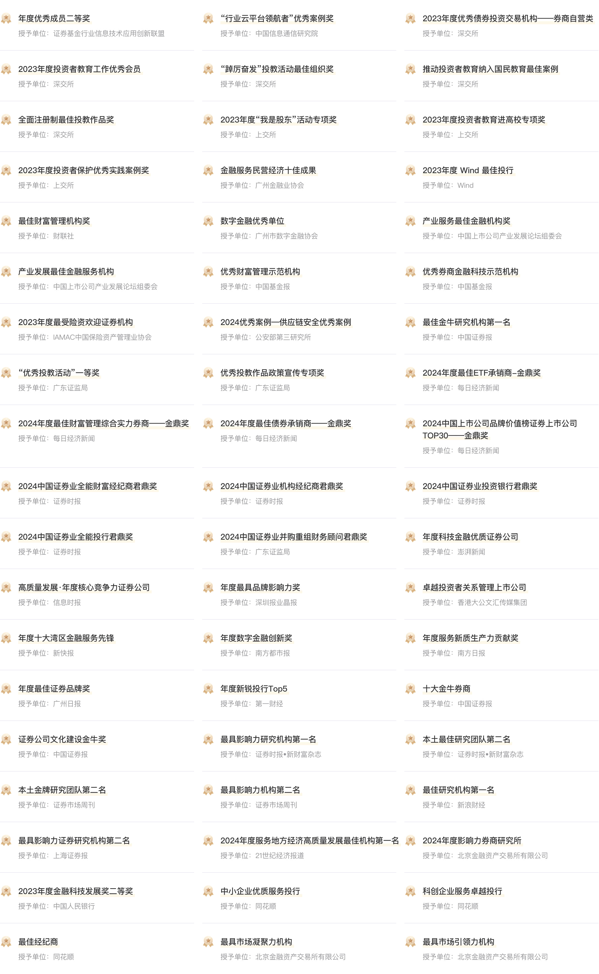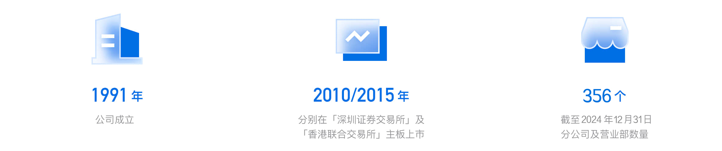- 公司简介 - 广发证券股份有限公司(以下简称“公司”)成立于1991年,是国内首批综合类证券公司,先后于2010年和2015年在深圳证券交易所及香港联合交易所主板上市(股票代码:000776.SZ,1776.HK)。30多年来,公司坚持深耕广东、布局全国、拓展海外,全业务链布局完备,各项业务均衡发展,主要经营指标始终稳居行业前列,是中国资本市场最具影响力的证券公司之一,也是20世纪80年代末至90年代初成立的第一批券商中为数不多的未经历过因经营亏损而接受注资和重组的主要券商之一。 ![]() 广发证券始终坚持“以客户为中心”导向,是专注于中国优质企业及众多有金融产品与服务需求的投资者,拥有行业领先创新能力的资本市场综合服务商。公司拥有投资银行、财富管理、交易及机构和投资管理四大业务版块,具有全业务牌照,能够满足企业、个人及机构投资者、金融机构及政府客户的多样化金融需求,为客户提供全生命周期、全业务链的综合金融服务,并在研究、资产管理、财富管理等多个核心业务领域形成了领先优势。 截至2024年末,公司旗下拥有广发期货有限公司、广发控股(香港)有限公司、广发信德投资管理有限公司、广发乾和投资有限公司、广发证券资产管理(广东)有限公司、广发融资租赁(广东)有限公司6家全资子公司,控股广发基金管理有限公司,参股易方达基金管理有限公司(并列第一大股东);公司拥有356家分公司及营业部,网点布局覆盖全国31个省、直辖市、自治区,粤港澳大湾区珠三角九市营业网点家数及覆盖占比均为行业第一。2024年末公司总资产7,587.45亿元,归属于上市公司股东的所有者权益1,476.02亿元。2024年,公司实现营业收入271.99亿元,实现归属于上市公司股东的净利润96.37亿元。 展望未来,在金融强国建设的伟大征程中,站在证券行业深度变革的历史关口,公司将一如既往服务强国战略,坚持把功能性放在首位,做好金融“五篇大文章”,以专业能力构建为核心、以全方位综合服务为导向,科学调整业务布局,积极拥抱科技浪潮,主动创新变革,持续提升发展质量和市场竞争力,为资本市场高质量发展贡献广发力量,奋力谱写建设国际一流投行的崭新篇章! ![]() - 公司历程 - ⼴发证券成⽴于1991年,2010年在深交所上市,2015年在港交所上市,是国内第三家A+H股上市券商。 ![]() - 公司组成 - ⼴发证券通过旗下⼦公司为境内外客户提供涵盖期货、公募基⾦、证券公司资产管理、私募投资基⾦、另类投资、跨境业务等综合⾦融服务。 ![]() ![]() ![]() |